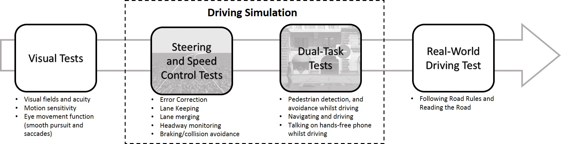 Visual function is considered uniquely important for driving because it provides multiple critical sources of information that when combined ensures successful steering. There are, however, additional cognitive functions that are essential for the driver to be able to dynamically respond to the world and make predictions about the scene, as well as the behaviour of other road users. Given the complexity of driving through a busy urban environment it should be no surprise that simple tests of visual acuity seem to have weak explanatory power in terms of increased crash risk when driving. Despite this, fitness to drive still includes a formal assessment of visual acuity, with poor scores being used to revoke the driving licence. The 'gold standard' measure of driving ability remains the on-road driving test but compared to visual tests they are fairly uncontrolled, susceptible to great variation depending on the road conditions, and are unable to reliably detect subtle visual deficits. To address some of the limitations of these existing tests we use examples from two simulator settings (steering control and hazard detection) that highlight the merits of using driving simulation in order to control the visual conditions and probe specific functional capabilities of drivers. When used in conjunction with visual tests these methods will not only determine whether the core functions of driving are intact but also be able to provide richer feedback to individuals about the nature of their deficits. There are many exciting possibilities using simulation techniques to establish predictive relationships between routine visual testing and driving performance, ultimately aiming for better, more reliable assessment of fitness to drive.Metrics